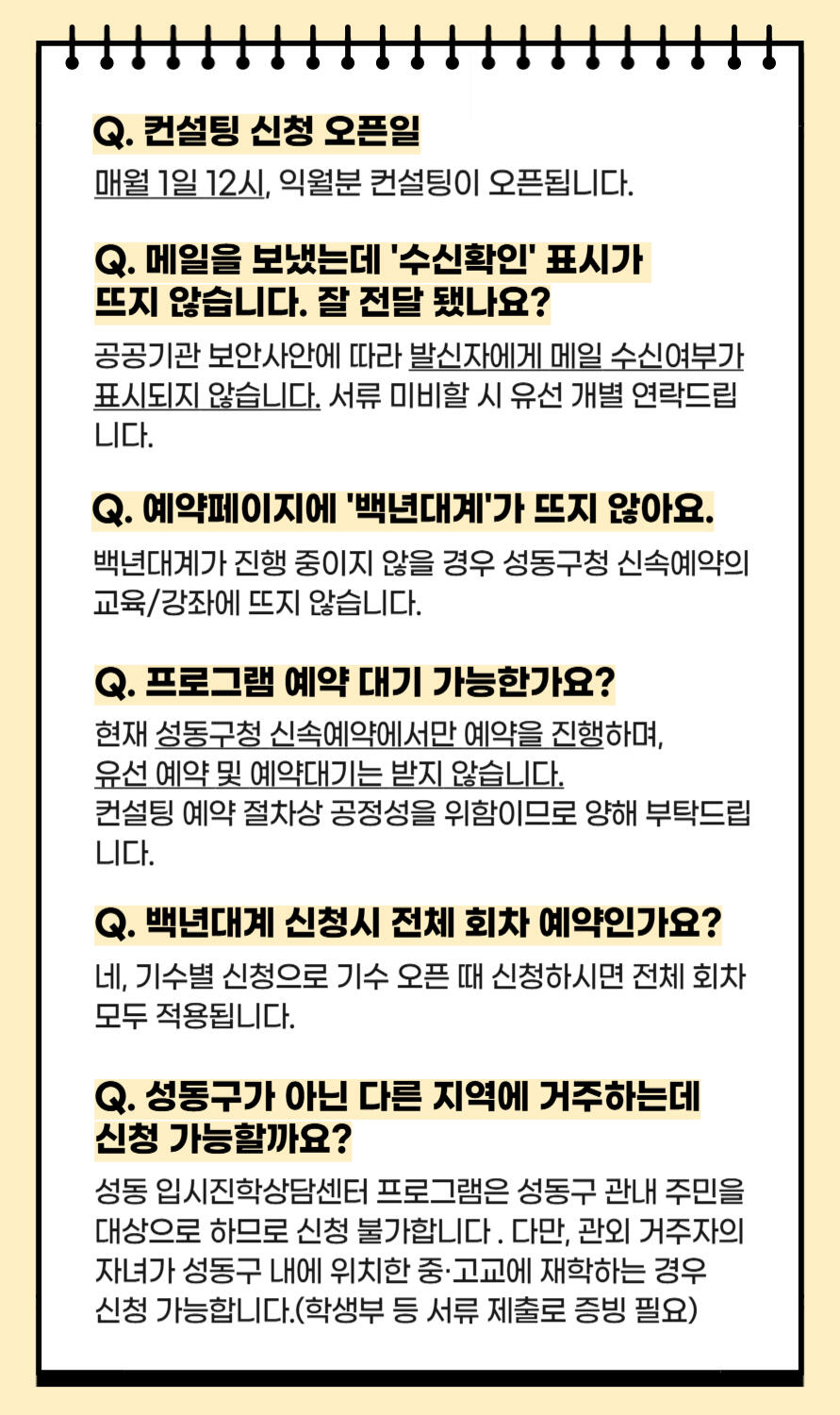 ○ 신청: 매월 1일 점심 12:00 다음달 컨설팅 신청 접수